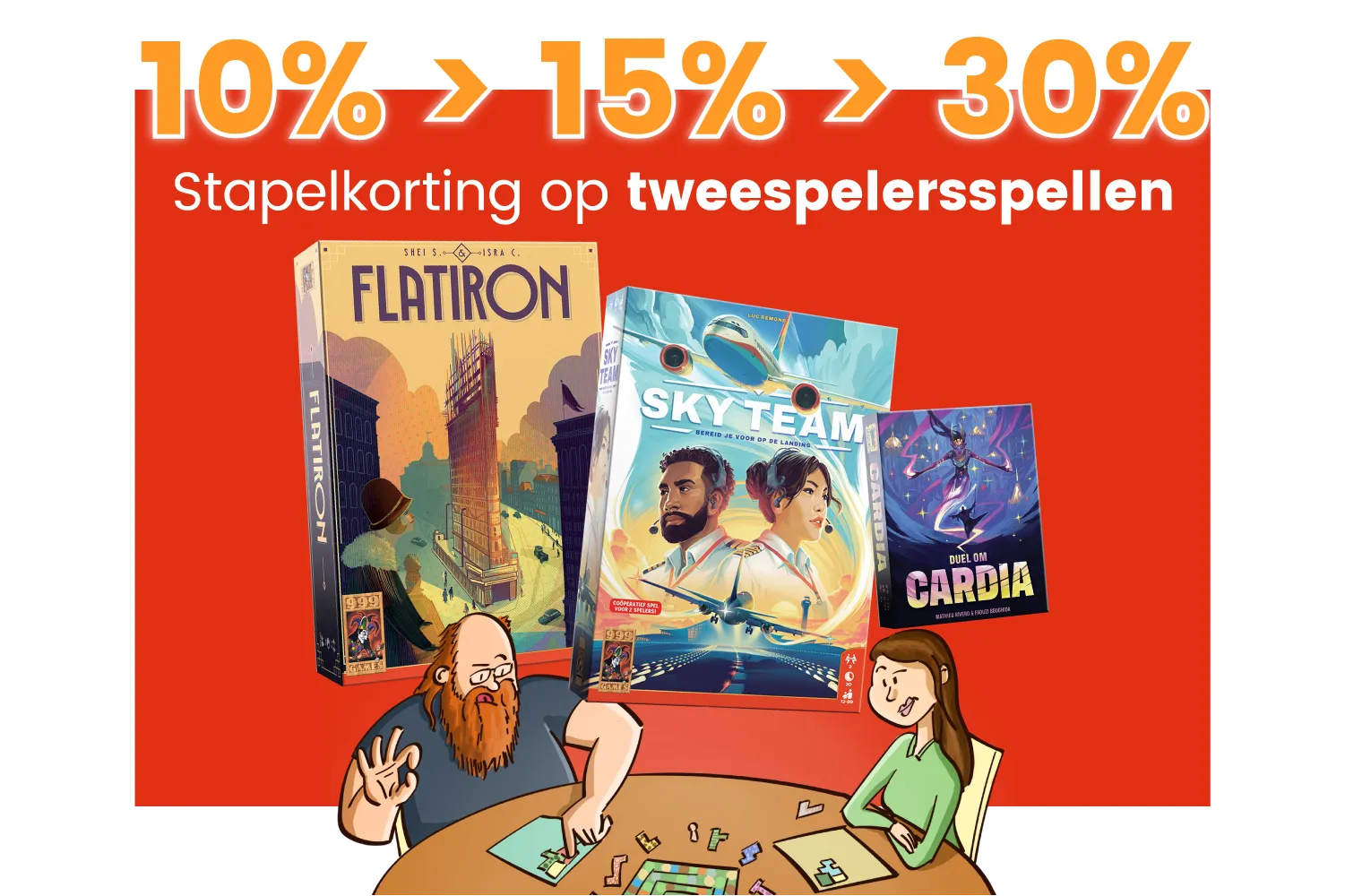 999 Games duikt vandaag in de spellen voor twee en je krijgt hierbij stapelkorting. Kies je er één krijg je 10% korting, kies je er twee dan krijg je 15% korting en bij drie krijg je 30% korting. De aanbieding zie je hier.